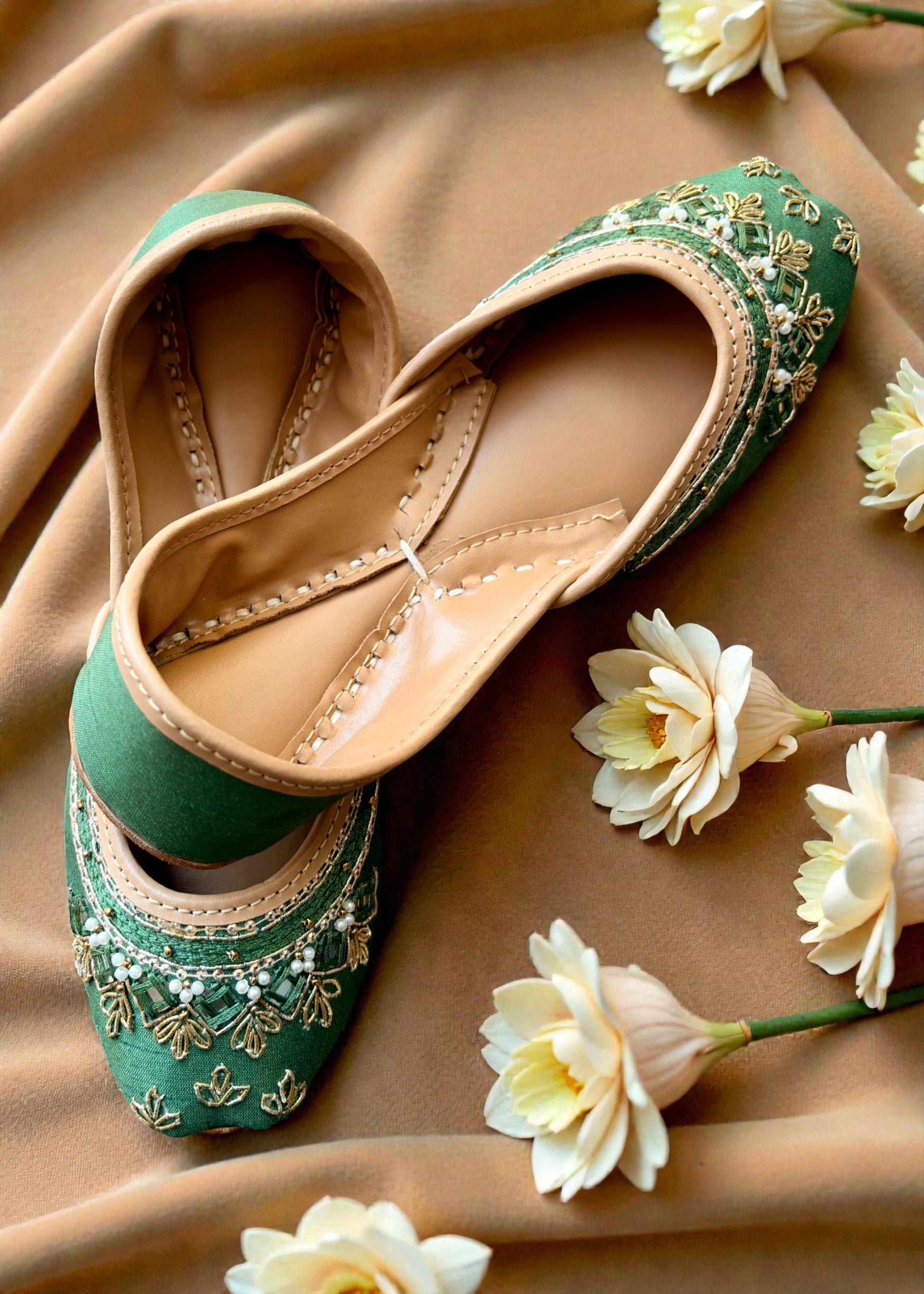 Step into elegance with our handcrafted green jutti, featuring intricate golden embroidery and timeless traditional charm
