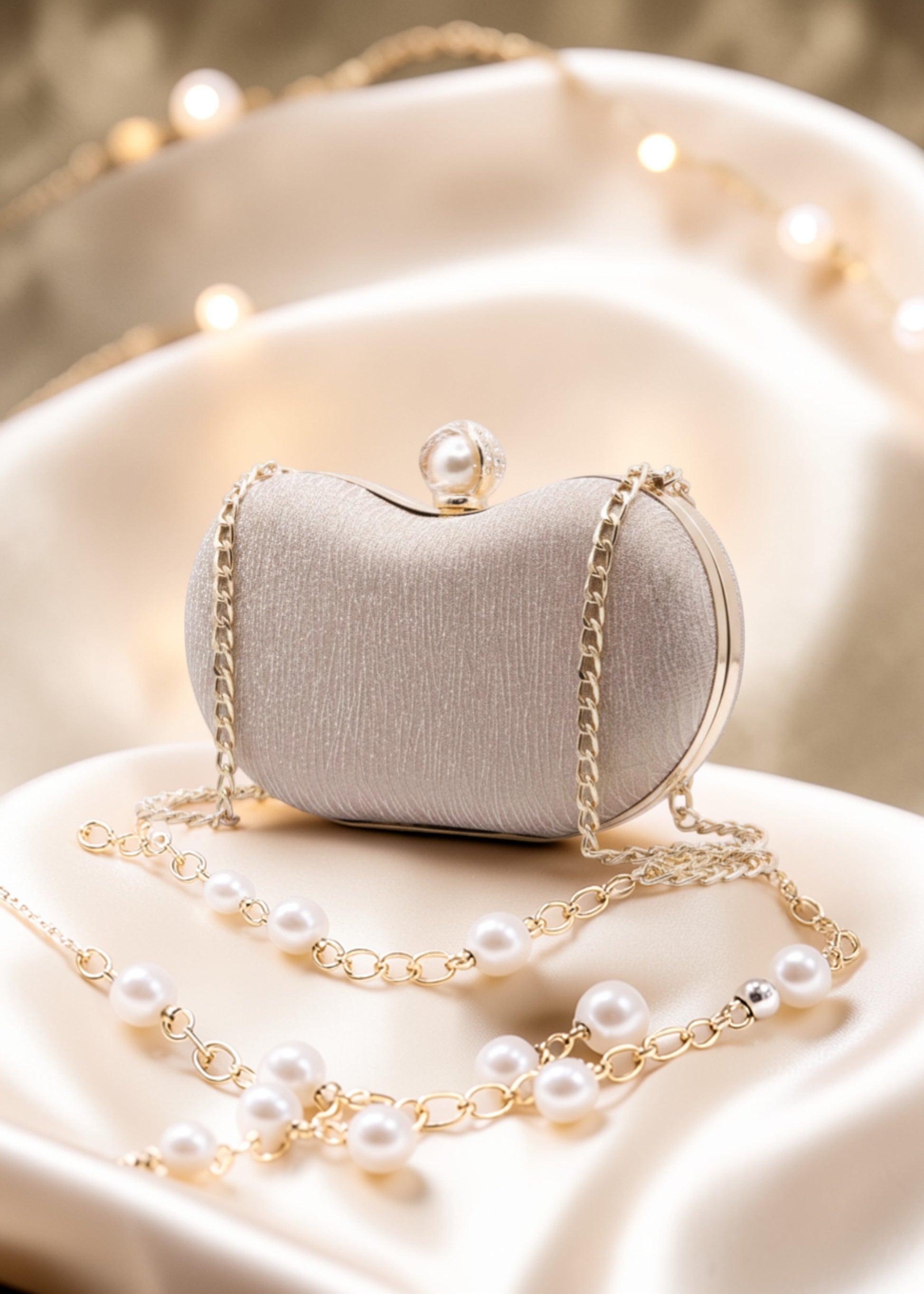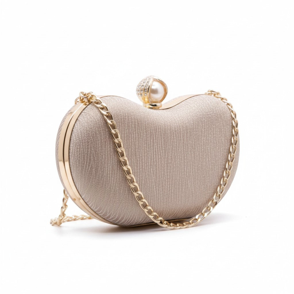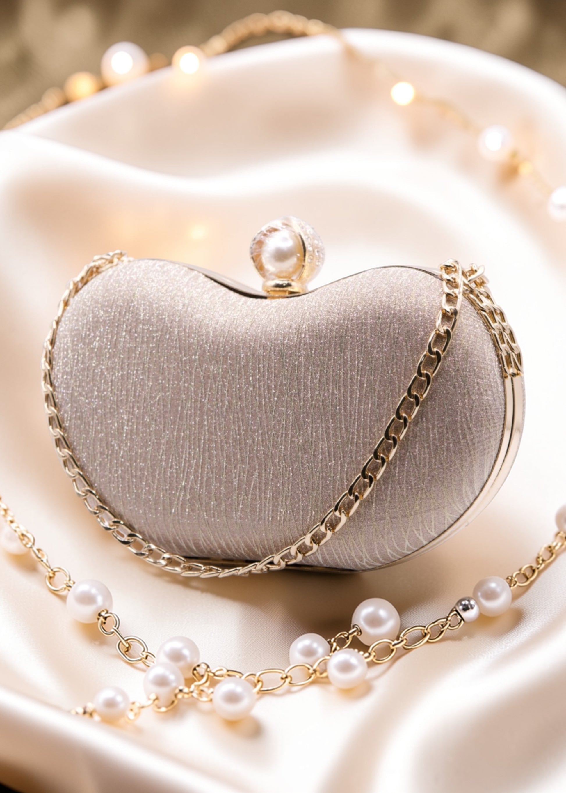 Delicate shine with timeless charm. Crafted in a champagne gold shimmer finish and accented with a pearl clasp and elegant gold chain, this clutch is designed to elevate your festive and formal looks effortlessly.