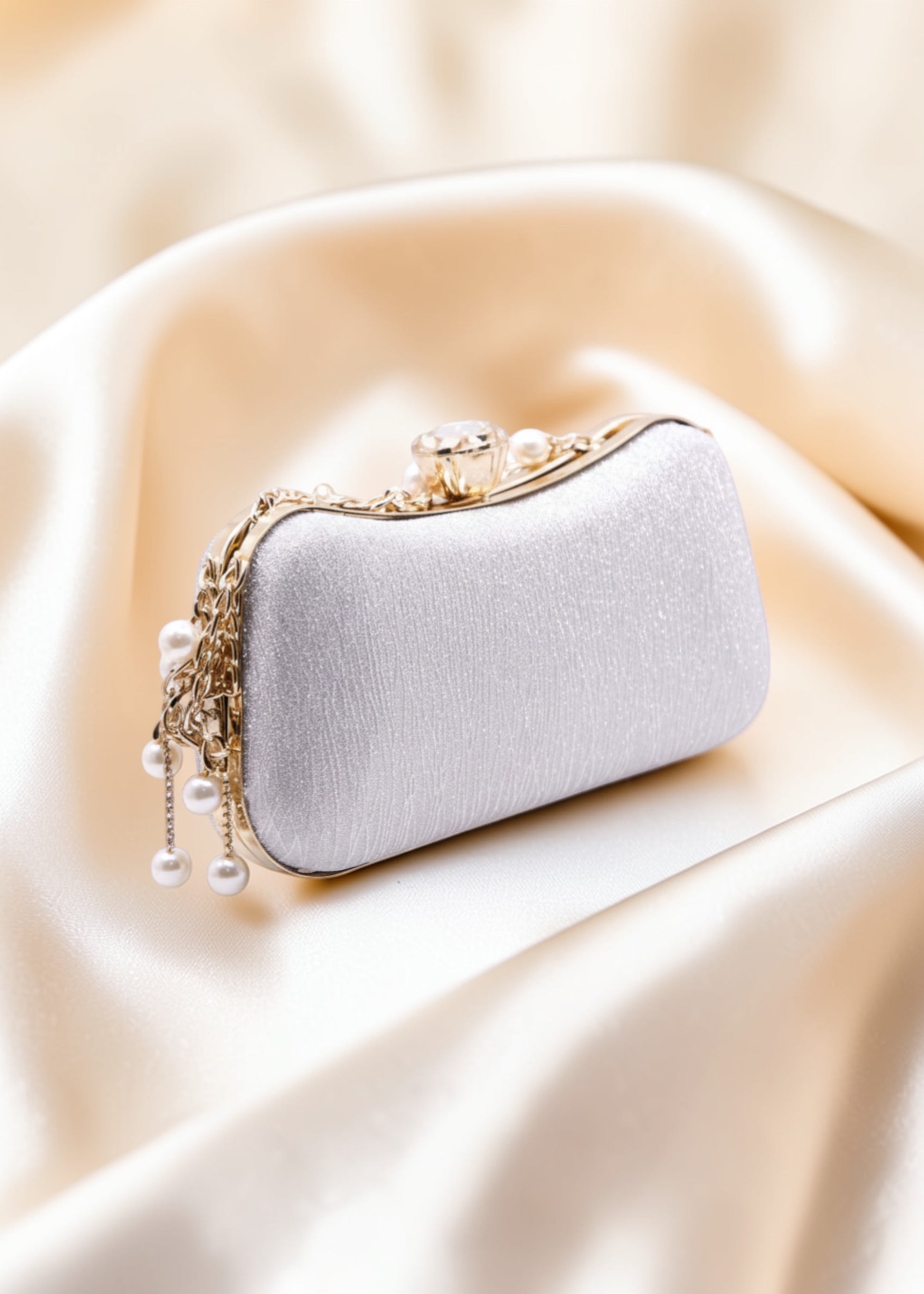 Understated elegance meets timeless design. Crafted in a soft silver satin finish with a delicate pearl chain and gold detailing, this clutch is the perfect companion for weddings and evening occasions.