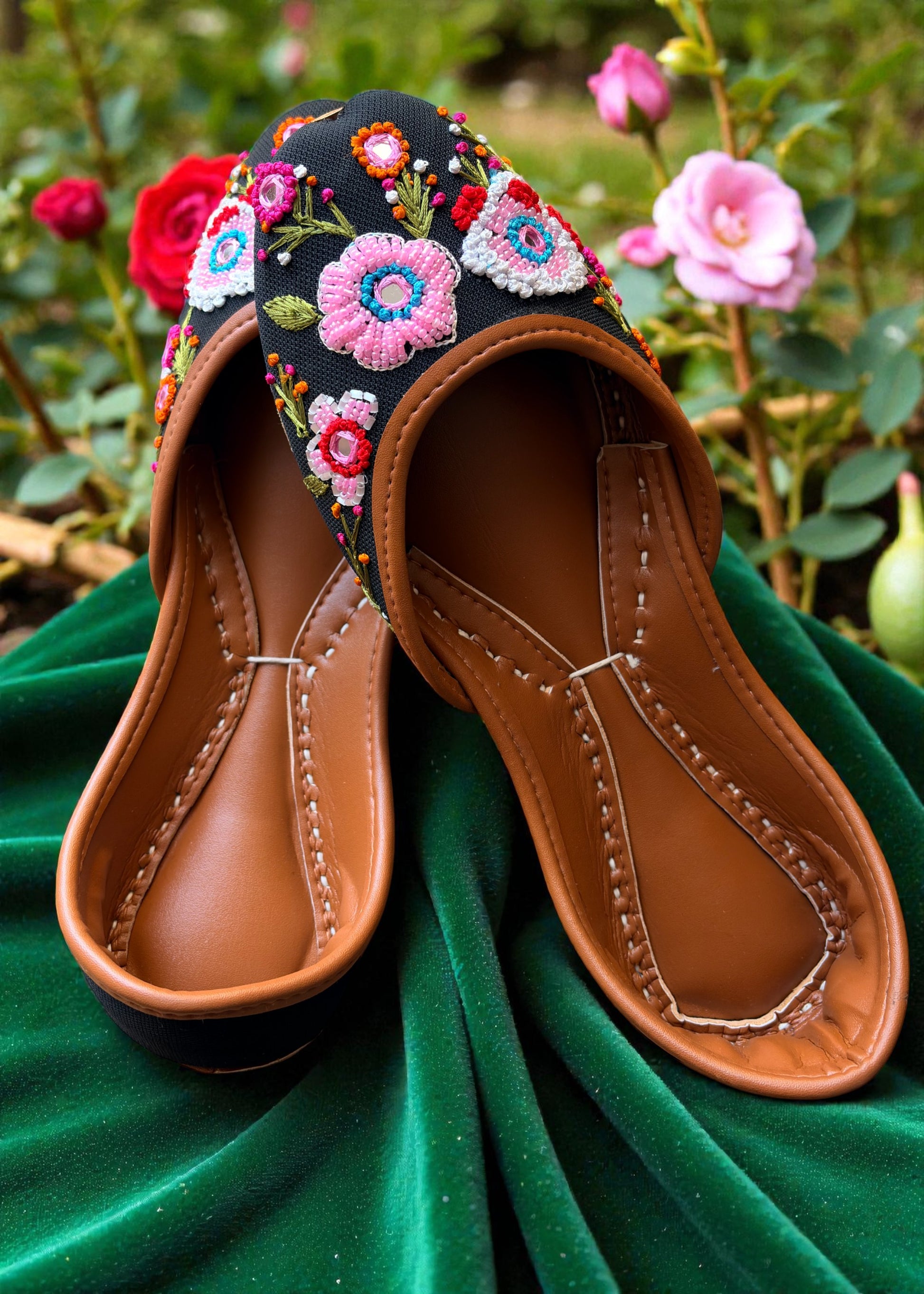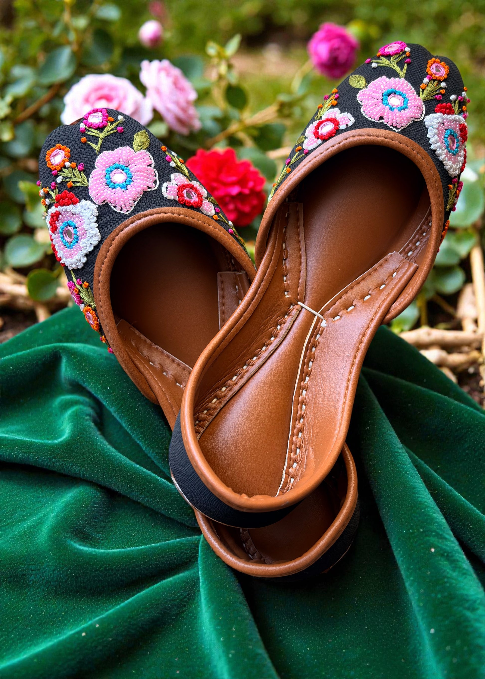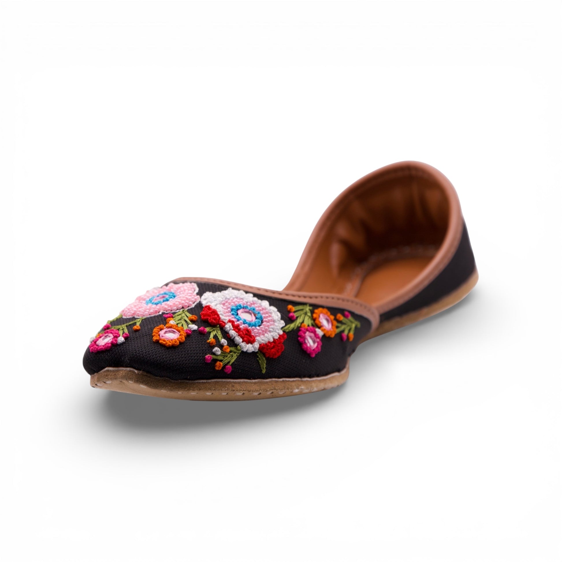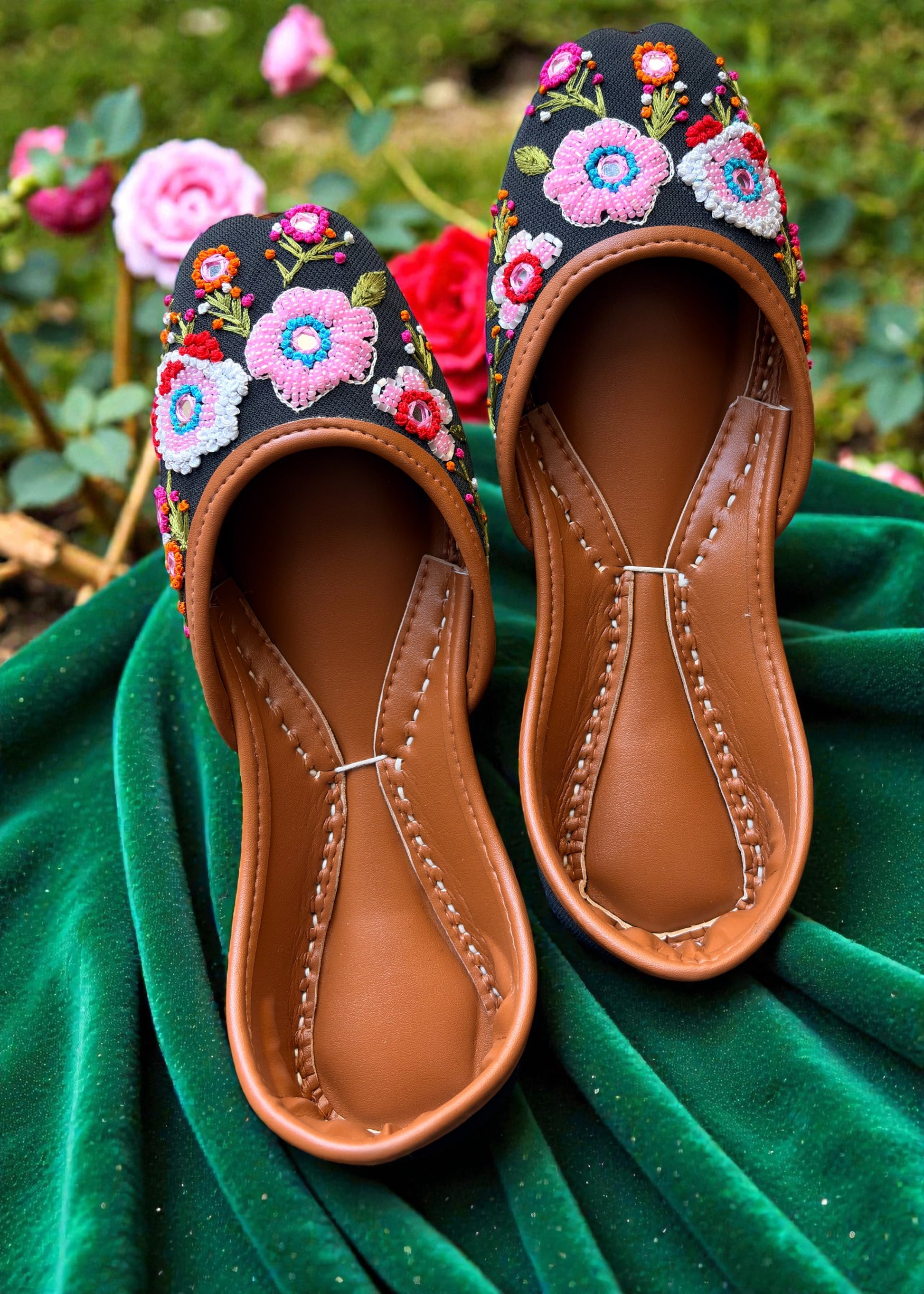 Rangrez, ab lack handcrafted khussa featuring vibrant floral embroidery and bead detailing, offering festive charm, bold color contrast, and comfortable wear for special occasions.
