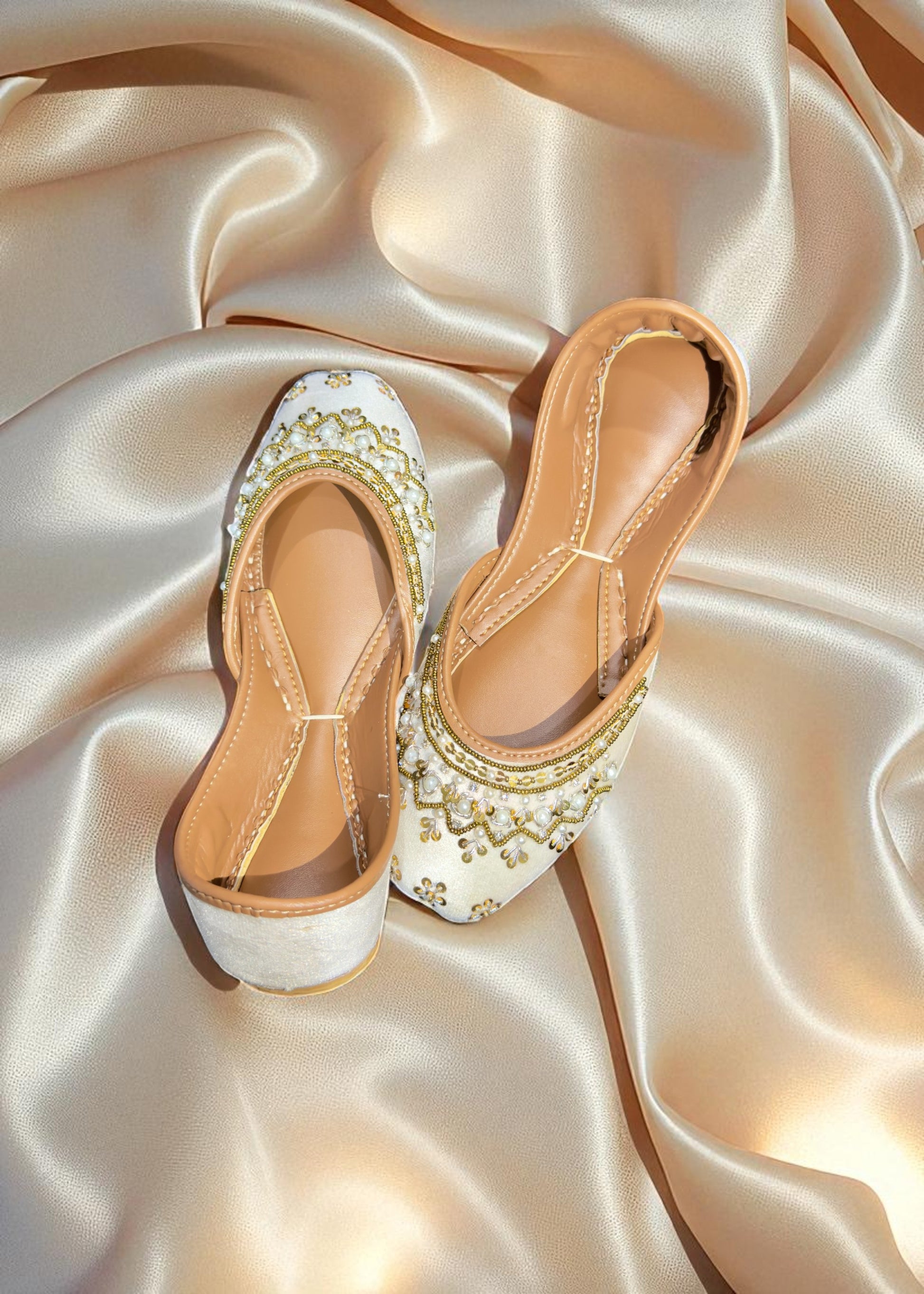 Elegant, versatile, and timeless, this handcrafted white jutti adds a touch of tradition to any look. Perfect for festive wear or everyday charm.